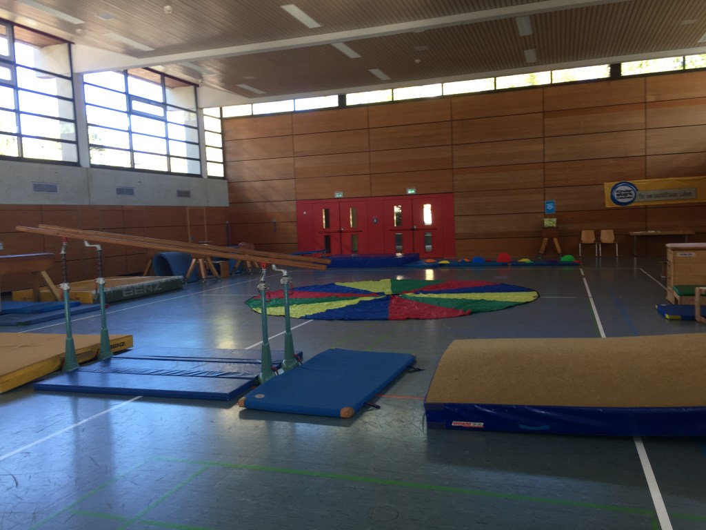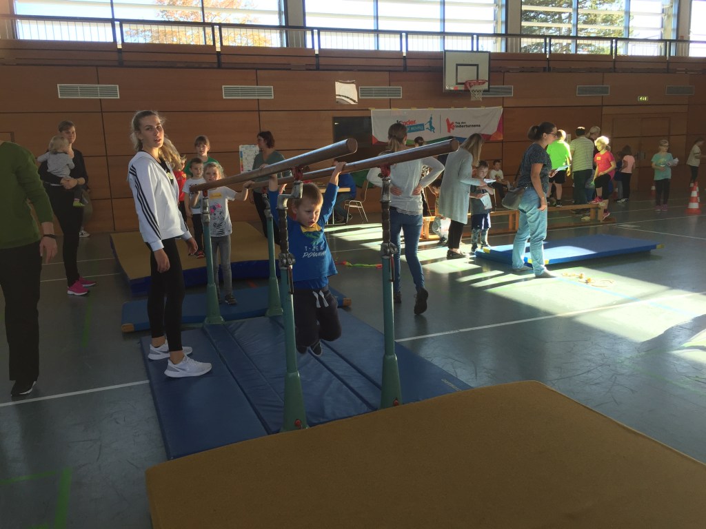 Der Rest der Turn- und Festhalle wurde für einen großen Parcours genutzt. Drüber und drunter – springen und hangeln – hier wurde jede Muskelpartie gefordert. Mit Unterstützung von Nele und Lena schafften auch die Kleinsten die beiden schwierigsten Stationen und nach einigen Durchgängen klappte es dann oft auch ganz alleine. Wer zwischendurch eine kleine Verschnaufpause brauchte, der versuchte sich an der Schätzfrage: „Wie viele Bälle befinden sich in der Box?“.