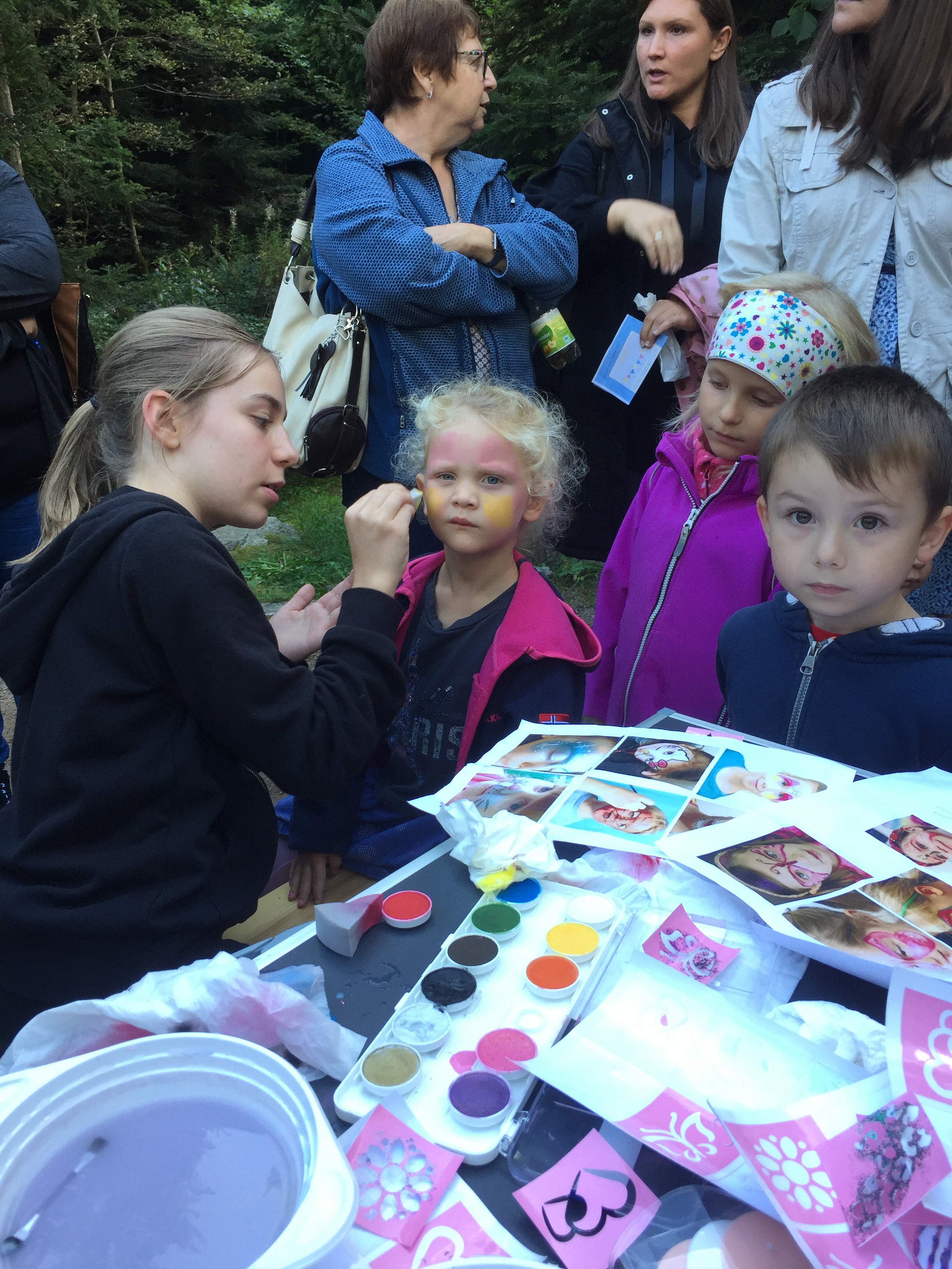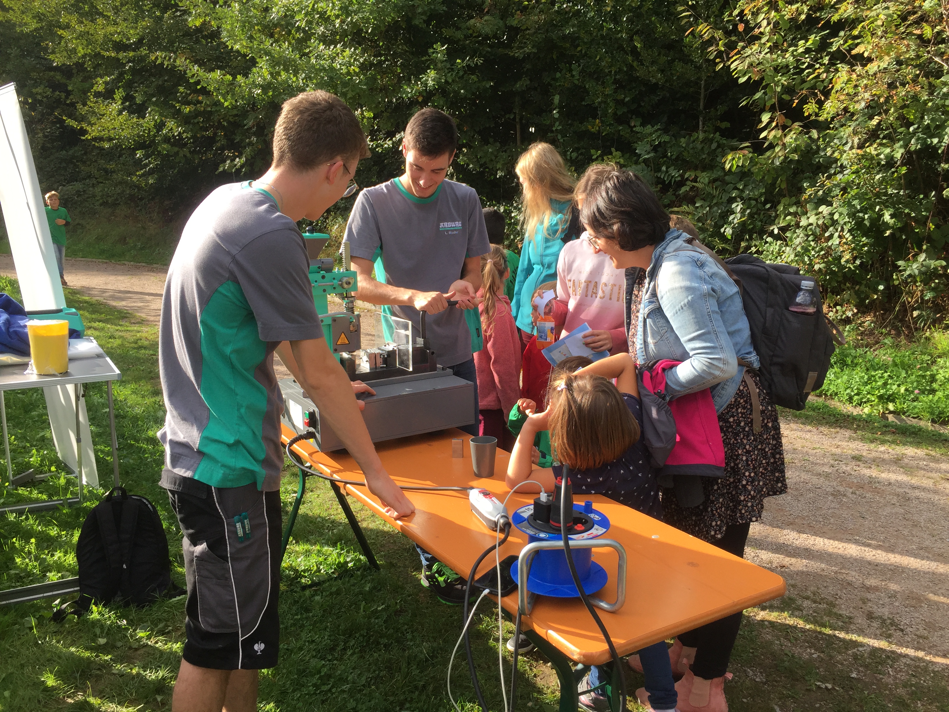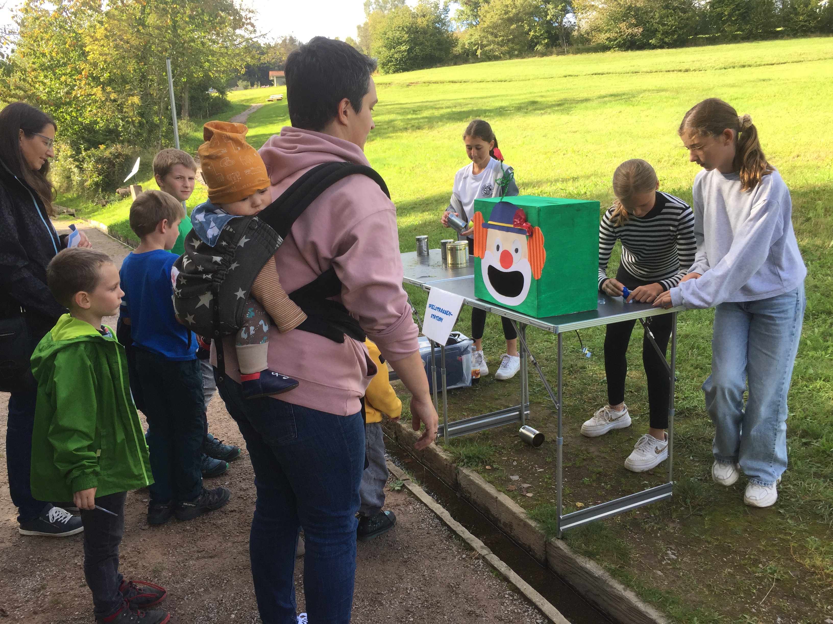 So gestärkt konnte es weiter auf Entdeckungstour gehen. In der „Naturecke“ konnten die Kinder bunte Pappschachteln basteln und diese im Anschluss am Stand der Gartenfreunde und der Gärtnerei Graf mit Erde füllen und Kressesamen einsäen. Nebenan entstanden mit den Mädels von Fridays for Future Samenbomben mit Ringelblumensamen und beim BUND konnten die Kinder Apfelsaft aus Streuobst-Äpfeln selbst pressen und verkosten. Sportlich ging es in der Hüpfburg und beim Fußball-Darts zu und mit etwas Geschick gelang es allen Kindern auch an der Süßigkeitenschleuder eine Kleinigkeit zu gewinnen. Beim Stand der Firma Arburg konnten die Kinder unter Anleitung selbst Einkaufswagen-Chips herstellen und bekamen nebenbei die Funktionsweise der Handhebelmaschine erklärt. Lange Schlangen gab es beim Kinderschminken und den Luftballon-Figuren, wo die Jugendlichen alle Hände voll zu tun hatten, den Wünschen der Kinder gerecht zu werden. Das sich ihr Einsatz lohnte, zeigten zahlreichende strahlende Kindergesichter. Euch genauso wie allen anderen Helfern nochmal ein ganz herzliches Dankeschön!!!