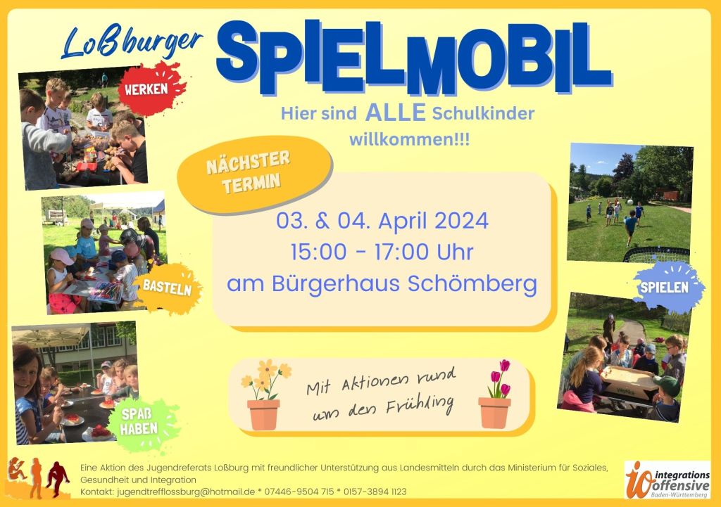 Update 03.04.2024: Aufgrund der kalten und nassen Wettervorhersage für heute und morgen Nachmittag wird das Spielmobil erst am Freitag, 05.04.204 auf den Schömberg kommen – da bringen wir dann die Sonne mit!!!