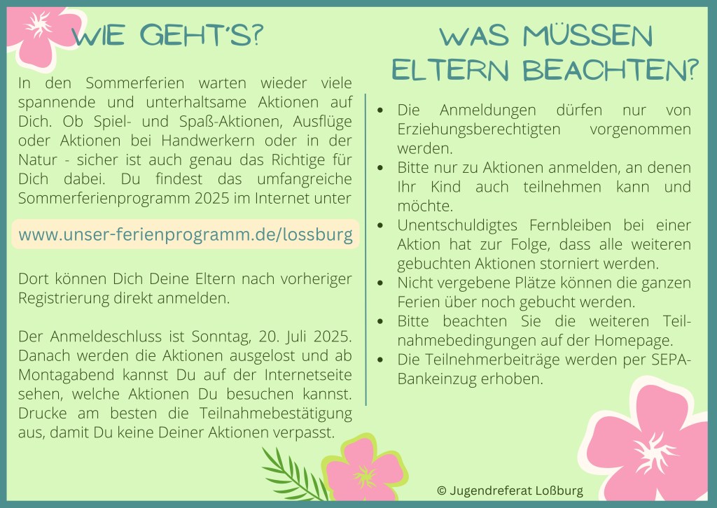 Damit in den Sommerferien keine Langeweile aufkommt, wurde wieder ein umfangreiches Sommerferienprogramm mit knapp 70 Aktionen zusammengestellt und ist nun online unter http://www.unser-ferienprogramm.de/lossburg zu finden. Das Programm hält wieder jeden Tag mindestens eine Aktion für Kinder und Jugendliche bereit. Von Spiel- und Spaß-Aktionen, über sportliche Aktivitäten, Ausflüge und Kreativ-Angebote – hier ist sicher für jeden was dabei!