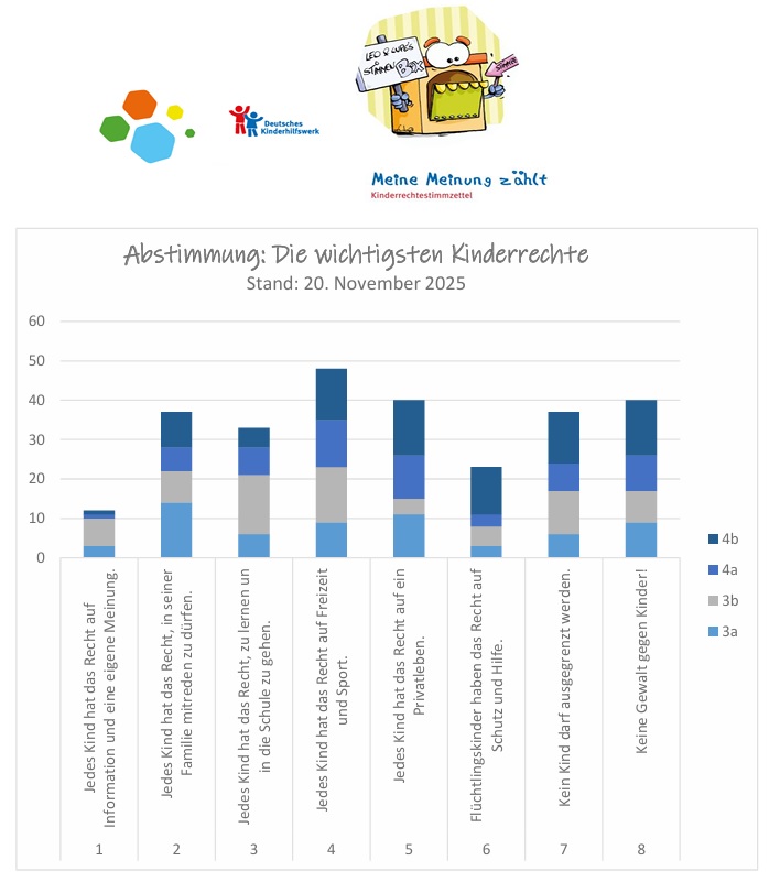Zum internationalen Tag der Kinderrechte haben wir die Umfrage „Deine Meinung zählt“ des Deutschen Kinderhilfswerks durchgeführt und damit eine Momentaufnahme der für die Kinder zu diesem Zeitpunkt wichtigsten Kinderrechte erhalten. Hierzu haben wir über die Woche verteilt alle 3.- und 4.-Klässler der Grundschule Loßburg befragt, da sie das Thema der Kinderrechte bereits behandelt hatten und wir das Thema so gut wieder aufgreifen konnten.