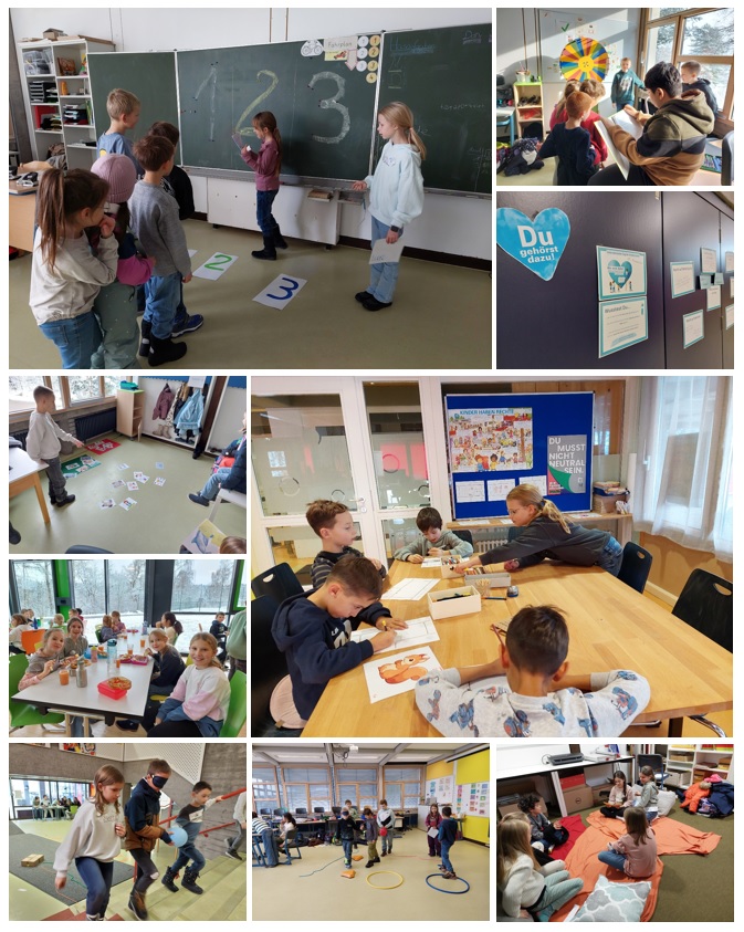 So gab es beispielsweise Fragen zu beantworten bei „1, 2 oder 3“ oder beim Glücksrad, bei den Filmstationen ging es um das Thema der Kinderbeteiligung (YouTube: „Clara und der Absperrzaun“), beim Parcours wurde das Recht auf Unterstützung bei Behinderung behandelt und die Bücher „Ich gehör dazu!“ und „Der besonderer Bär“ wurden vorgestellt. Alle hatten sich hierfür toll vorbereitet und empfingen die verschiedenen Gruppen der anderen Klassen mit Freude und ganz souverän.