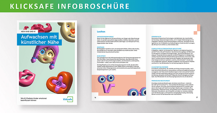 Die Initiative klicksafe gibt zum Thema „Mein Kind und KI“ zudem eine Infobroschüre heraus, die unter folgendem Link kostenfrei bestellt werden kann: https://www.klicksafe.de/materialien/mein-kind-und-ki-aufwachsen-mit-kuenstlicher-naehe